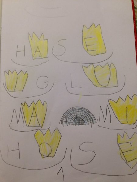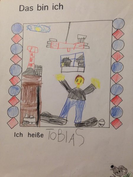 A német suliban az én nagy meglepetésemre (és megkönnyebbülésemre) nem kínozzák az elsősöket a folyóírás meg a betűkapcsolás, illetve a külalak rejtelmeivel. A kézírást azért nem hanyagolják teljesen a digitális bennszülöttek sem, a kis és nagy nyomtatott betűket ők is elsajátítják. Ez annyit tesz, hogy Tóbinak nincsen csíkos füzete, írás címén ilyeneket alkotnak:
